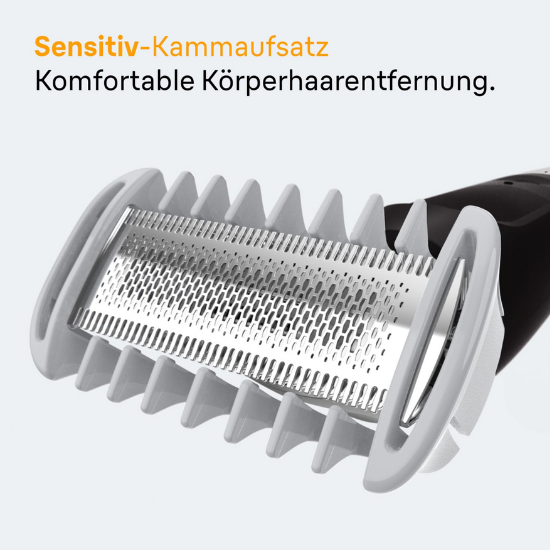 Die vier Gesichtskämme in 1, 2, 3 und 5 mm lassen sich leicht aufsetzen. Der extra Body-Kamm für empfindliche Bereiche fühlt sich weicher an – ideal für Achseln oder die Bikinizone. Angenehm ist, dass Braun nicht überall die gleiche harte Klinge einsetzt, denn Rasieren und Trimmen ist an jeder Körperstelle nun mal anders.