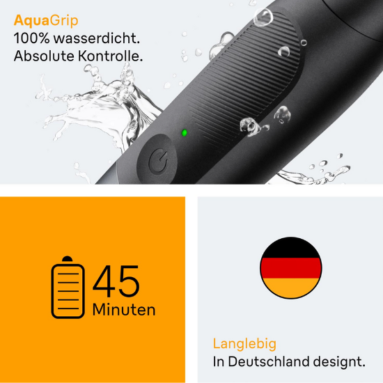 Der Trimmer ist komplett wasserdicht. Sie können ihn problemlos abspülen oder einfach mit unter die Dusche nehmen. Der AquaGrip-Griff liegt perfekt in nassen Händen – ideal, wenn Sie es morgens eilig haben, aber trotzdem schnell den Hals oder die Konturen nachziehen wollen.