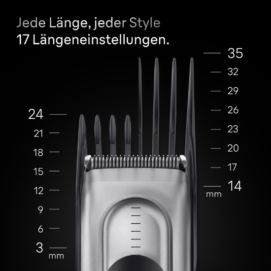 - 17 Schnittlängen mit Memory Lock: Mit zwei Aufsätzen stehen Ihnen 17 Längenstufen zwischen 3 und 35 mm zur Verfügung. Die intelligente Memory-Lock-Funktion speichert Ihre zuletzt gewählte Einstellung. Ideal, wenn Sie Ihre Frisur regelmäßig in derselben Länge schneiden möchten.