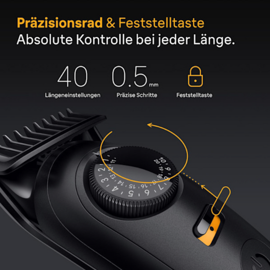 Der Braun Series 5 Barttrimmer wurde für maximale Kontrolle entwickelt. Das ultrascharfe Edelstahlmesser gleitet mühelos durch jeden Barttyp ob fein oder dicht. Mit dem PrecisionWheel wählen Sie ganz einfach aus 40 präzisen Längeneinstellungen in 0,5-mm-Schritten. So bestimmen Sie selbst, ob Sie einen kurzen Drei-Tage-Bart oder eine vollere, gleichmäßige Form bevorzugen.