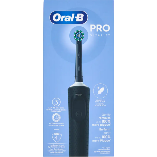 Die Oral-B Vitality Pro Black wiederaufladbare elektrische Zahnbürste ist Ihr wesentlicher Partner für eine effektivere, aber sanfte Zahnreinigung. Diese Zahnbürste bietet eine klinisch bewiesene überlegene Reinigung im Vergleich zu einer normalen Handzahnbürste.