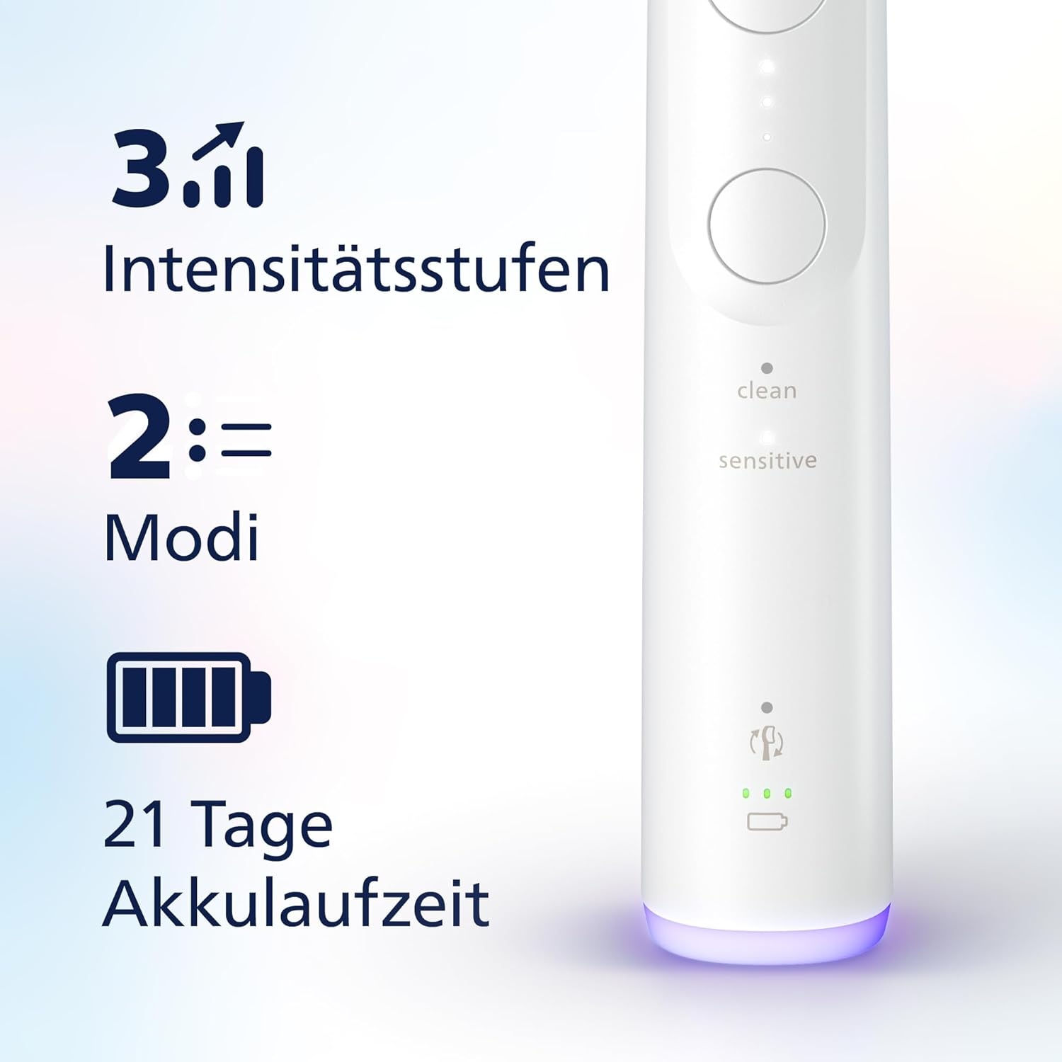 - 2 Putzmodi und 3 Intensitätsstufen: für eine vollständig personalisierte Putzroutine.