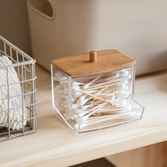 Die Kombination aus transparentem Kunststoff und natürlichem Bambus sorgt für eine frische, harmonische Optik. Der Wattestäbchen Spender passt perfekt neben Ihre Zahnbürste, Ihren Make-up Organizer oder Rasierprodukte. Alles ordentlich verstaut. Alles griffbereit.